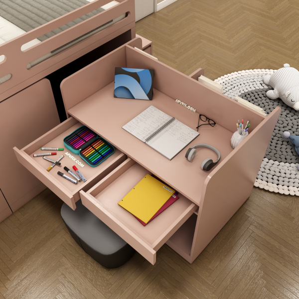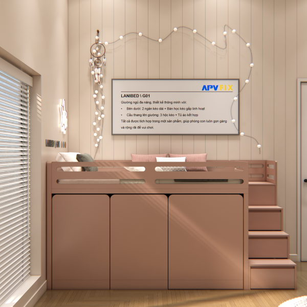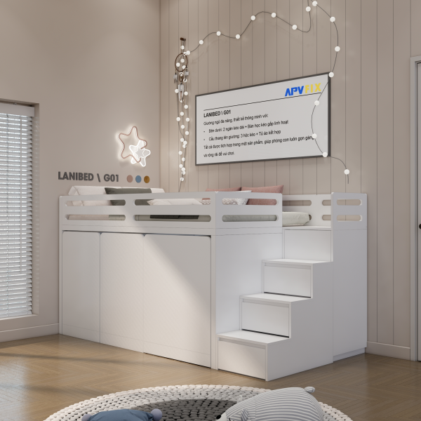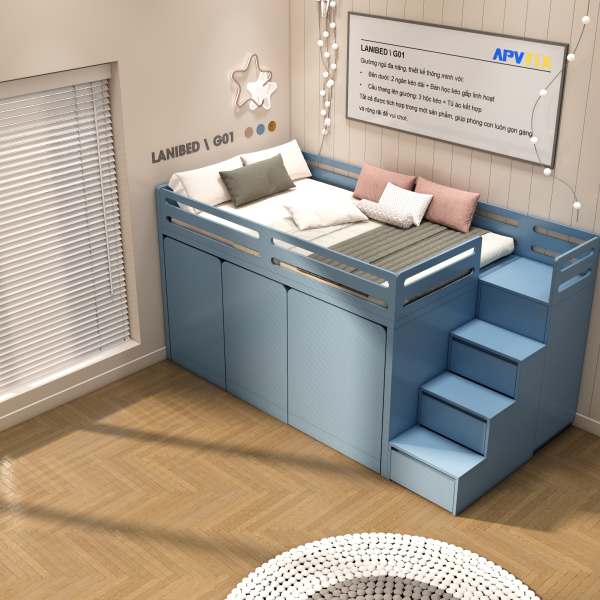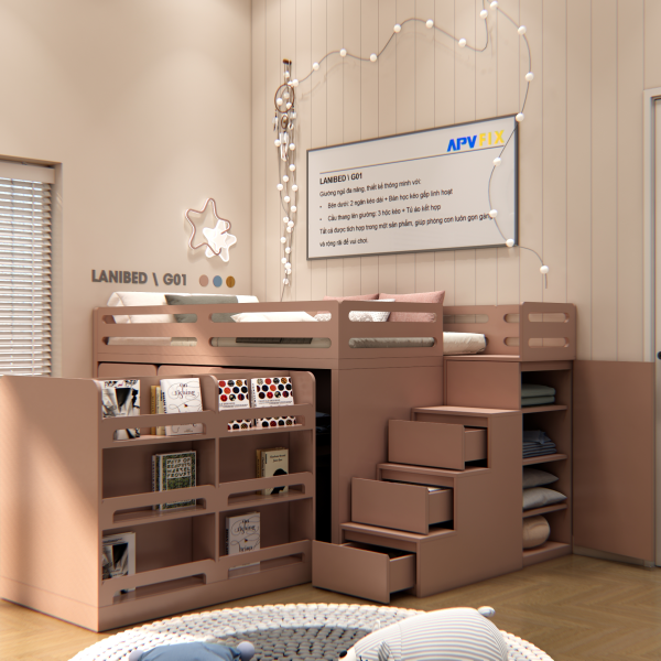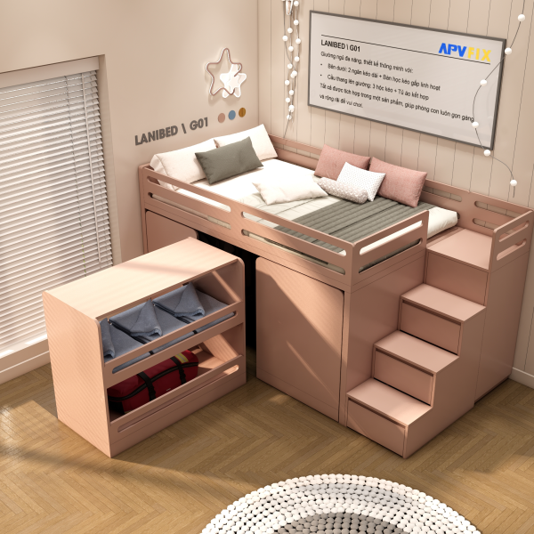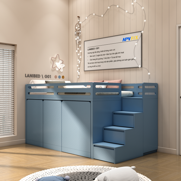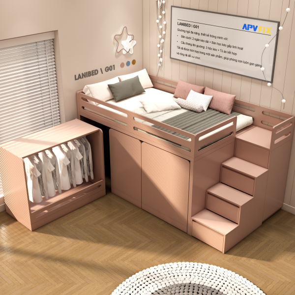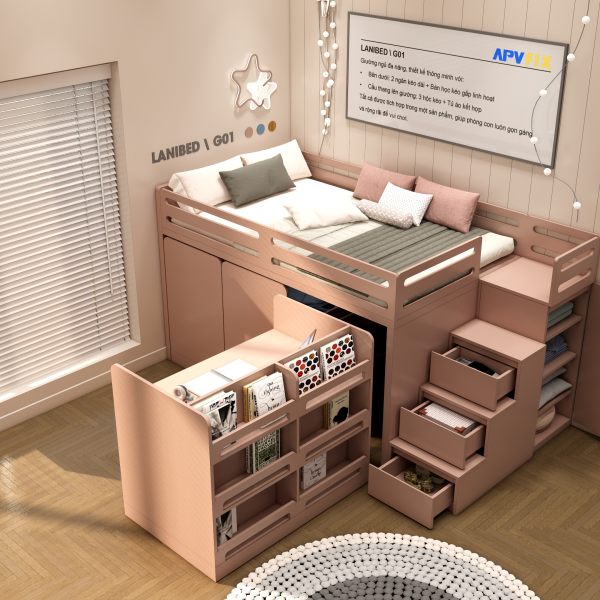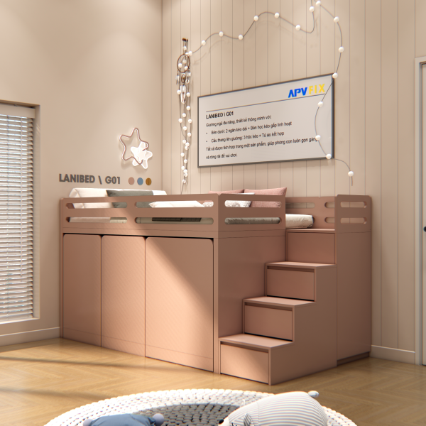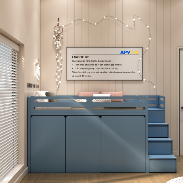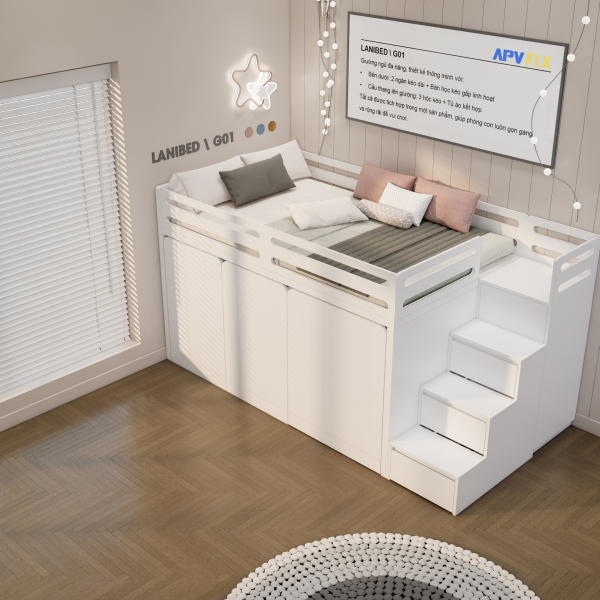 Giường ngủ trên cao, thiết kế thông minh với: Bên dưới: 2 ngăn kéo dài + Bàn học kéo gấp linh hoạt. Cầu thang lên giường: 3 hộc kéo + Tủ áo kết hợp. Tất cả được tích hợp trong một sản phẩm, giúp phòng con luôn gọn gàng và rộng rãi để vui chơi.