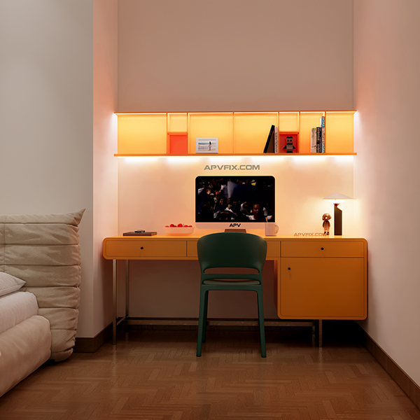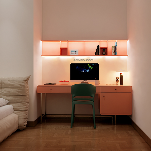 Ánh Sáng: Chi tiết đắt giá làm nên sự khác biệt chính là hệ thống led dây hắt sáng được tích hợp. Dải đèn LED này thường được bố trí phía dưới các kệ treo tường hoặc trong hốc tủ đa năng, không chỉ cung cấp nguồn sáng tập trung cho mặt bàn làm việc mà còn tạo hiệu ứng ánh sáng lung linh, làm nổi bật các món đồ trang trí và tăng chiều sâu không gian.