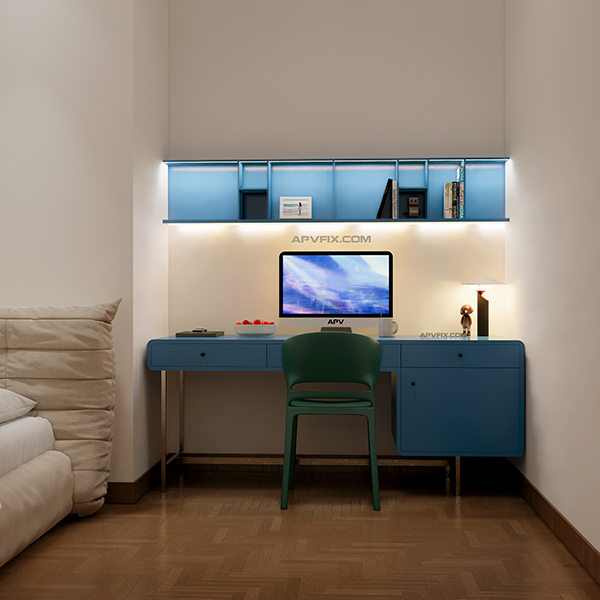 Phía trên bàn làm việc là tổ hợp tủ đa năng và kệ sách treo tường với kích thước 1600x300x300mm. Đây là giải pháp lưu trữ tuyệt vời, tận dụng tối đa không gian theo chiều đứng.